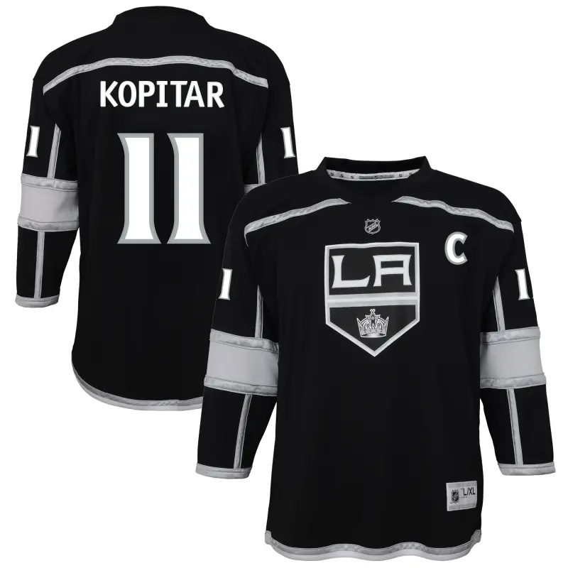 Los Angeles Kingsin Anze Kopitar -pelipaita, jossa irtonumero ja musta kotipelipaita.