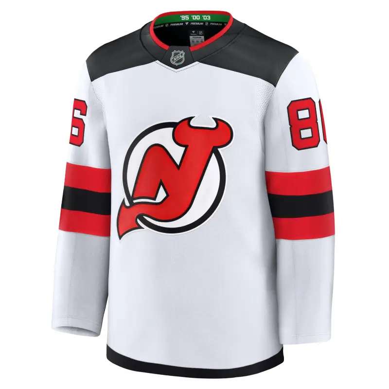 Miesten Fanatics Jack Hughesin New Jersey Devils -vieraspelipaita, valkoinen, Premium
