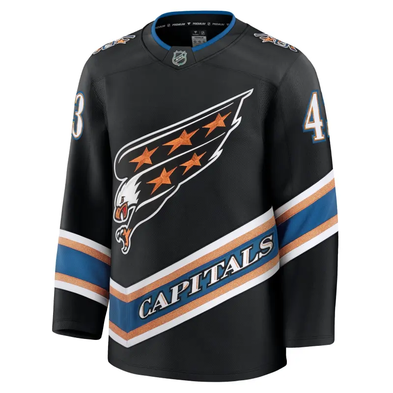 Miesten Washington Capitals – Fanatics Tom Wilsonin 50-vuotisjuhlavuoden Premium-pelipaita. Musta.