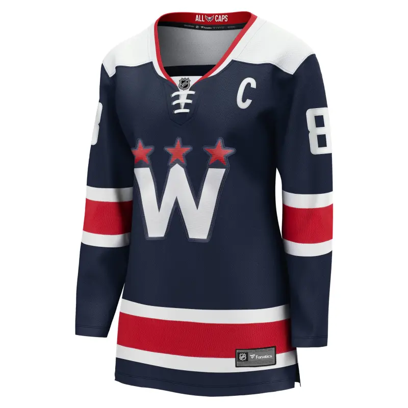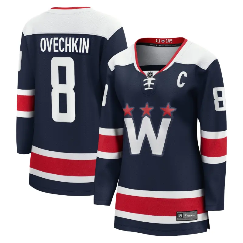 Naisten fanaatikot Alexander Ovechkinin laivastonsininen Washington Capitalsin vaihtoehtoinen Premier Breakaway -pelipaita kaudelle 2020/21.