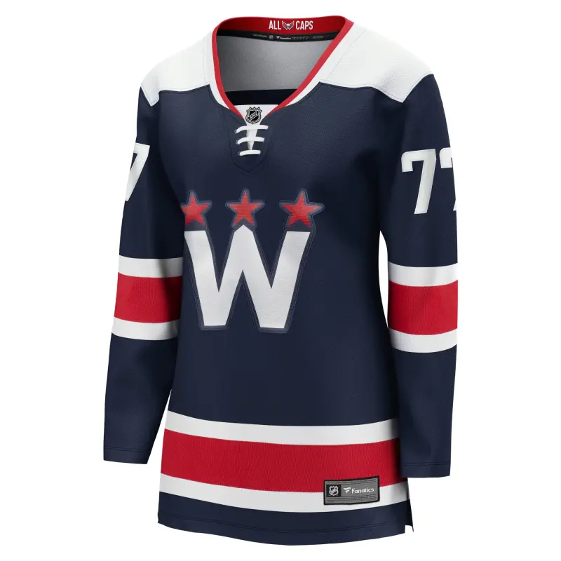 Naisten Fanatics TJ Oshie Washington Capitals -pelipaita kaudelle 2020/21 ja vaihtopelaajan vaihtopeliin.