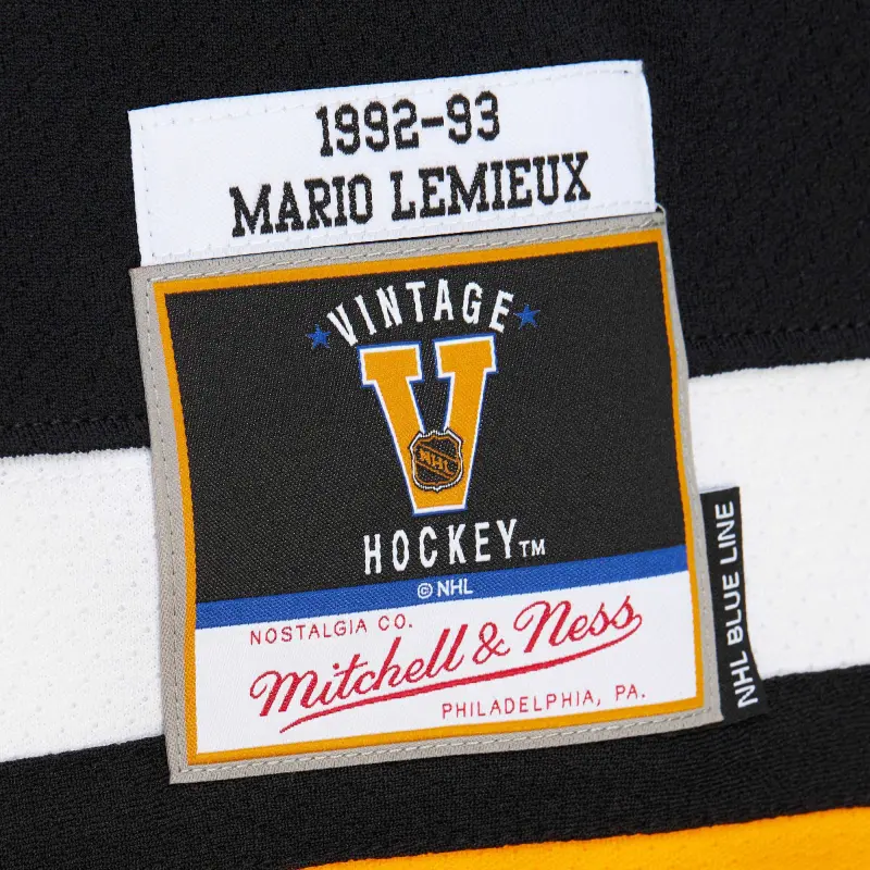 You can feel like you're hitting the ice with the greats by putting on this Mario Lemieux Pittsburgh Penguins 1992/93 Blue Line Player Jersey from Mitchell & Ness. This jersey features authentic Pittsburgh Penguins colors and graphics, exactly like what Mario Lemieux wore during his time with the team.